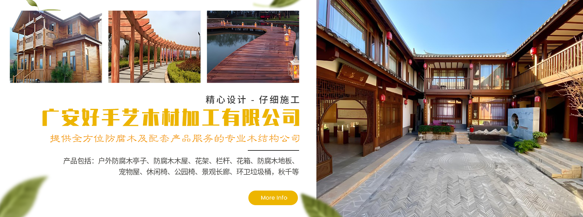 廣安好手藝木材加工有限公司專業從事防腐木木材的生產及銷售,企業立足防腐木材生產、銷售、設計、咨詢為一體的綜合性企業,產品包括:戶外防腐木亭子、防腐木木屋、花架、欄桿、花箱、防腐木地板、寵物屋、休閑椅、公園椅、景觀長廊、環衛垃圾桶,秋千等公共配套設施的生產、銷售、安裝。 公司擁有一批從事木材研究的技術人,及精良的安裝施工隊伍,現代化的生產設備。經過風雨歷練,積累了大量的采購、開發、研究生產、銷售、安裝防腐木材的豐富經驗。 產品可廣泛應用于公共休閑場所、湖邊棧道、旅游景點、戶外